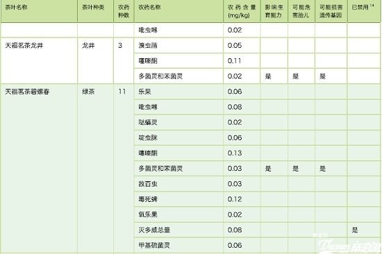 報(bào)告負(fù)責(zé)人王婧稱綠色和平的調(diào)查人員隨機(jī)購(gòu)買了18種普通消費(fèi)者最經(jīng)常接觸的中檔茶葉、售價(jià)在60元至1000元一斤,品種涵蓋綠茶、烏龍茶和茉莉花茶等、檢測(cè)結(jié)果顯示,9個(gè)品牌的所有18個(gè)茶葉樣品全部含有至少三種農(nóng)藥殘留、12份茶葉樣本檢出滅多威、硫丹及氰戊菊酯等違禁農(nóng)藥殘留,14份含有多菌靈、苯菌靈等影響生育能力、胎兒發(fā)育或可能損害遺傳基因的農(nóng)藥殘留。