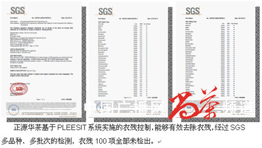 正源華茶基于PLEESIT系統(tǒng)實(shí)施的農(nóng)殘控制,能夠有效去除農(nóng)殘,經(jīng)過(guò)SGS多品種、多批次 的檢測(cè),農(nóng)殘100項(xiàng)全部未檢出。
