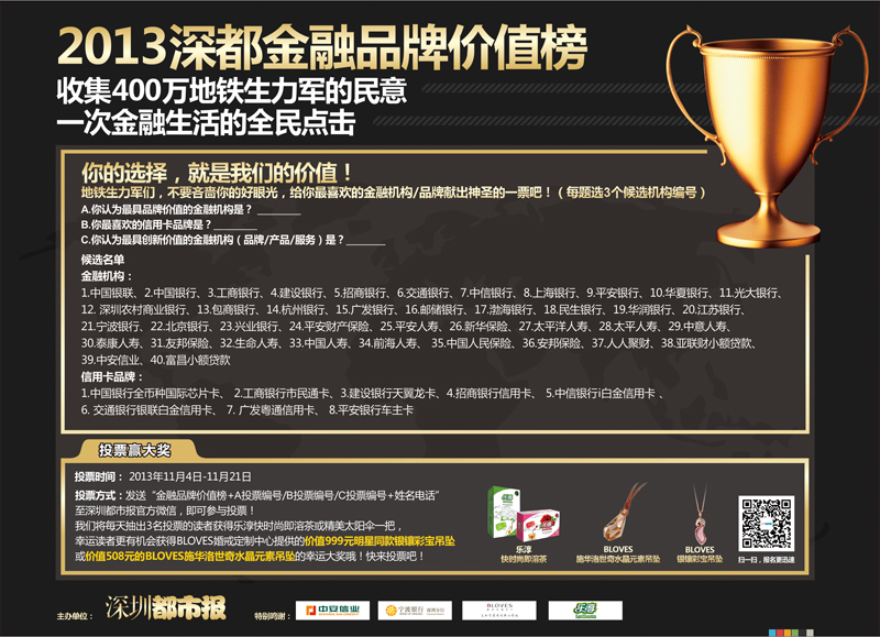 由《深圳都市報(bào)》主辦,正源華茶全力支持的2013深都金融品牌價(jià)值榜評選活動(dòng)在11月1日拉開帷幕,本次活動(dòng)為期一個(gè)月,通過深圳都市報(bào)、網(wǎng)絡(luò)等多種形式,邀請深圳400萬乘坐地鐵生力軍參與評選,共同見證本年度金融機(jī)構(gòu)的創(chuàng)新碩果。